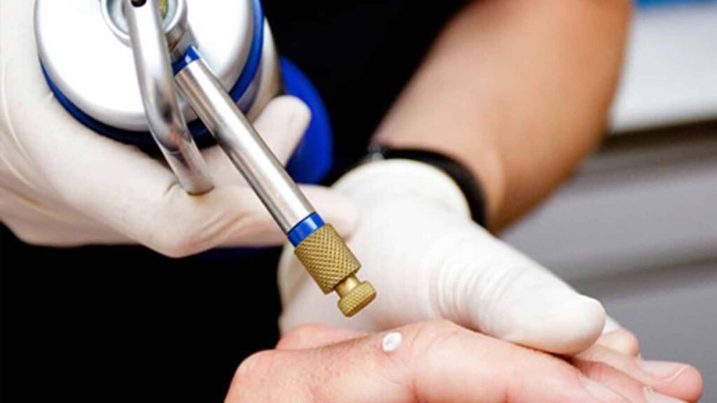 Kriyoterapi basınç altındaki sıvı azot gazının dokuya uygulanması ile yapılır. Sıvı azot düşük sıcaklık değerlerinde ve belirli bir basınçta kriyo cihazı içerisinde muhafaza edilmektedir. Bu cihaz bir sprey kutusunu andırır ve tedaviye uygun özel uçları ile birlikte gelir. Kriyoterapi, -198 C derece sıcaklığındaki sıvı azotun dokuya püskürtülmesi yada pamuklu çubukla uygulanması ile yapılır. Böylece, ani sıcaklık değişimi dokuyu öldürür ve doku yenilenmesi hedeflenir.